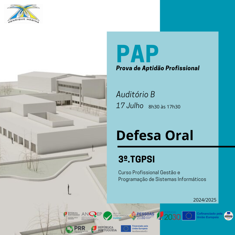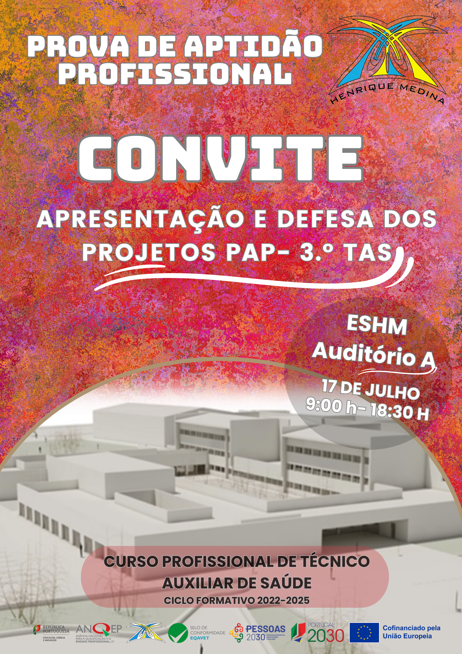 No dia 18 de março, entre as 14h e as 18h, no auditório A da Escola Secundária Henrique Medina, vai ter lugar a apresentação do Desenvolvimento das Provas de Aptidão Profissional (PAP) dos alunos do 3.º ano do Curso Profissional de Técnico Auxiliar de Saúde. |